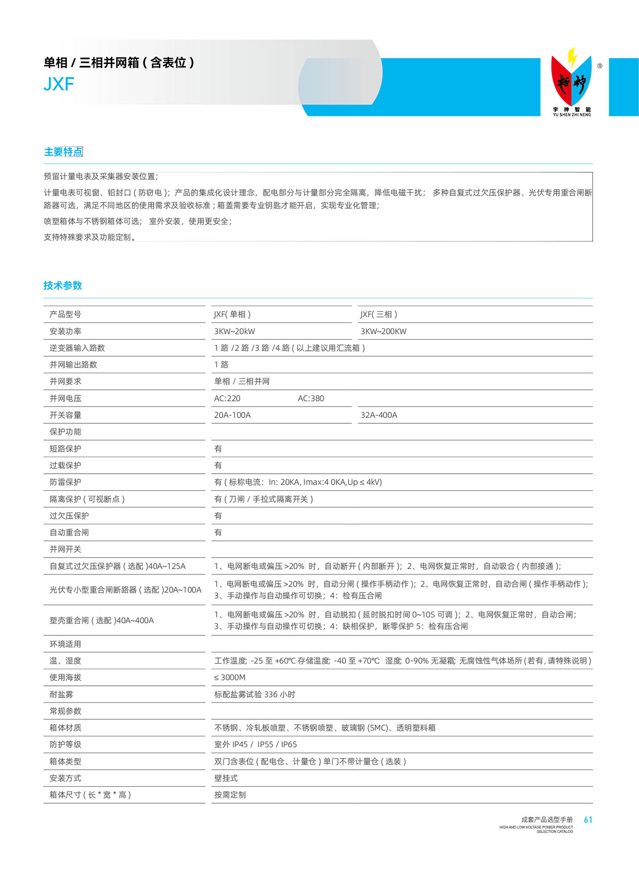 JXF主要应用于户用光伏分布式并网发电系统,小型工商业光伏发电系统,串接在并网逆变器和电网之间,产品具有防孤岛保护 检有压合闸失压跳闸电网低压、电网过压、输入防雷、系统过流、电网隔离等一系列保护,精确的电能计量、传输与智能化的运行控制是家庭式并网发电系统中必不可少部分,产品通过行业标准 CCC认证、CE 认证